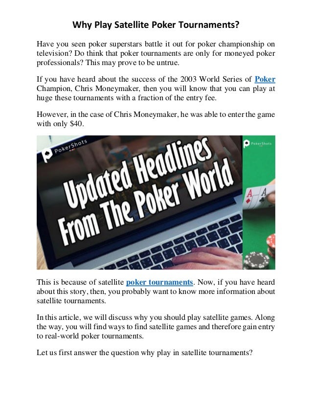 A satellite tournament is a tournament centered around a larger tournament. Players get to win a seat to a more expensive buy-in tournament. Chris Moneymaker is a great example. He entered an online satellite tournament for the WSOP for $39. He went on to win $2.5 million. His win inspired many others to join the world of poker online. He was the first person to become a world champion after qualifying at an online poker site. The poker site was PokerStars, a leading online poker room.